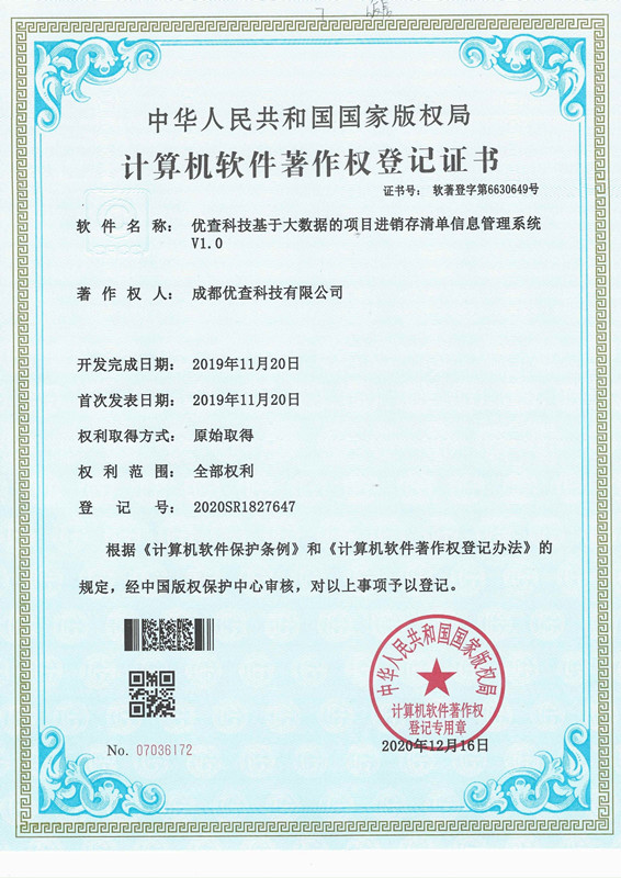 中华人民共和国国家版权局授予优查科技6项计算机软件著作权,